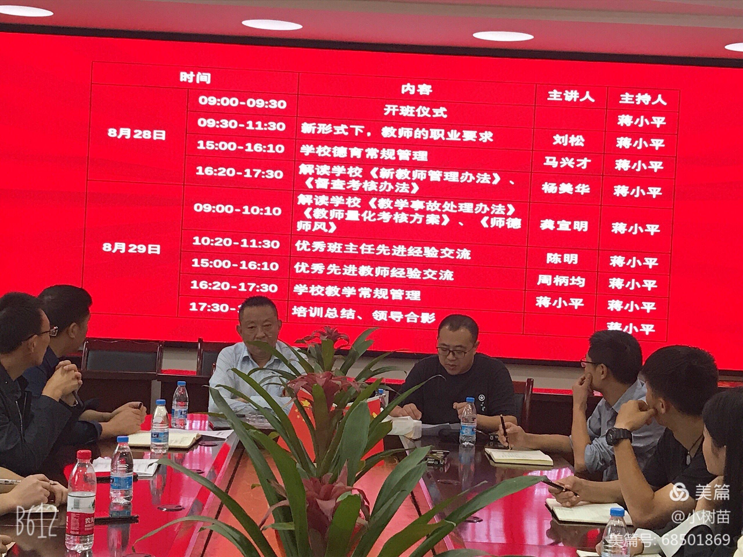 关注 ( J- t) i1 U+ h Q3 l 8月28日上午,我校2021年“新教师岗前培训”开班仪式在圆桌会议室举行。刘松校长,龚宜明、马兴才、杨美华副校长,各系部主任、教务处、教科室以及新入职的16名教师参会。会议由教务处蒋小平主任主持。/ e2 q0 Q$ g. W6 }/ R! c
