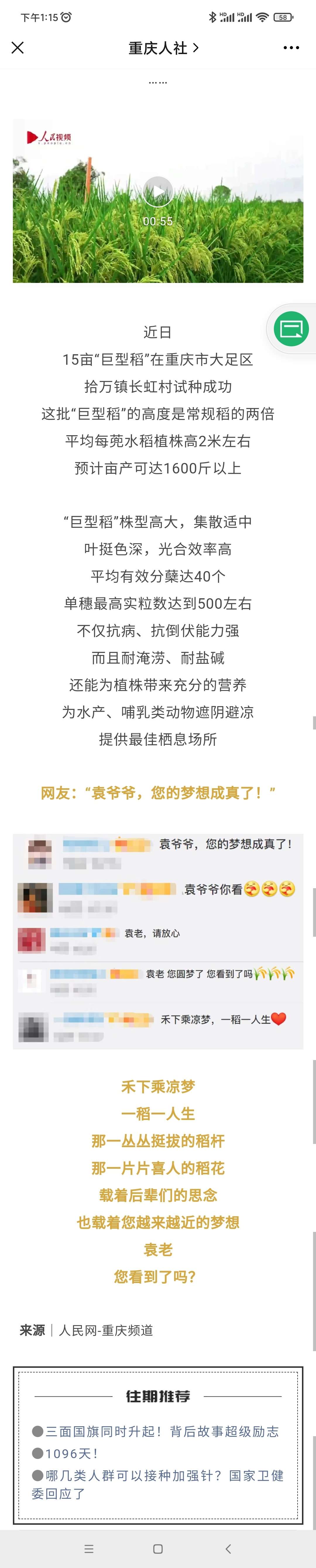 “杂交水稻之父”袁隆平5月22日在长沙逝世,享年91岁这位自称“90后”的中国工程院院士一生都在为其广为人知的两个梦想——“禾下乘凉梦”和“杂交水稻覆盖全球梦”不懈奋斗如今袁老离去已三月有余而他的“禾下乘凉梦”正一步步变为现实…… 来源:重庆人社* R8 P' r! [6 V3 y$ o