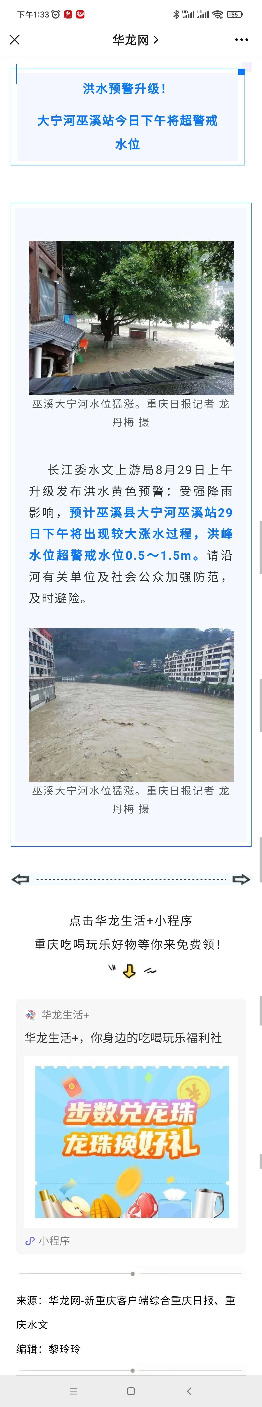重庆市水文监测总站发布消息,受强降雨影响,任河水位持续上涨,城口县任河城口站2021年8月29日3时15分水位746.60米,超警戒水位0.10米,“任河2021年第1号洪水”已经形成。( e$ s& @& V6 H, w8 F. d2 \