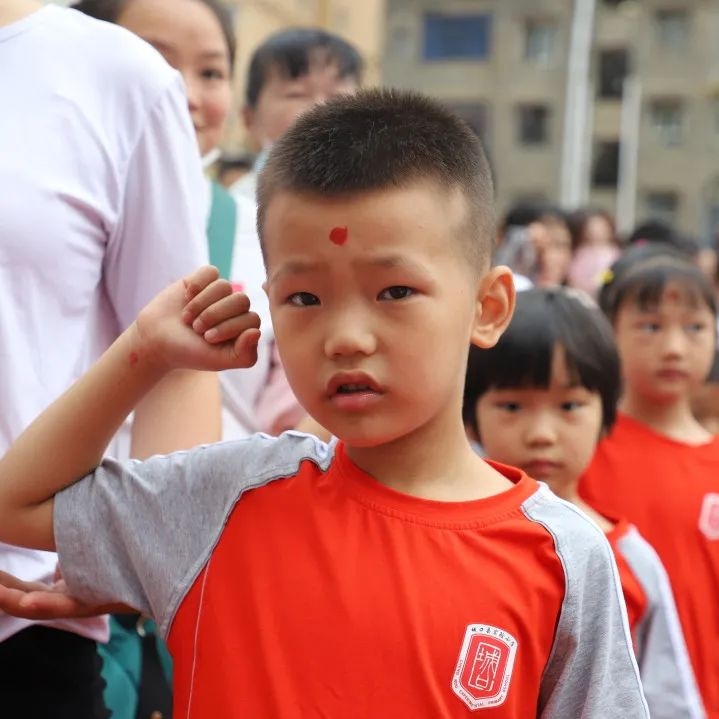 学校领导,一年级班主任及班科老师在孩子们的额头上一一点上朱砂,为孩子们开启智慧,送上祝福,寓意孩子们从此眼明心亮。希望一年级的所有小朋友们,眼明心明好读书,健康快乐大成才!