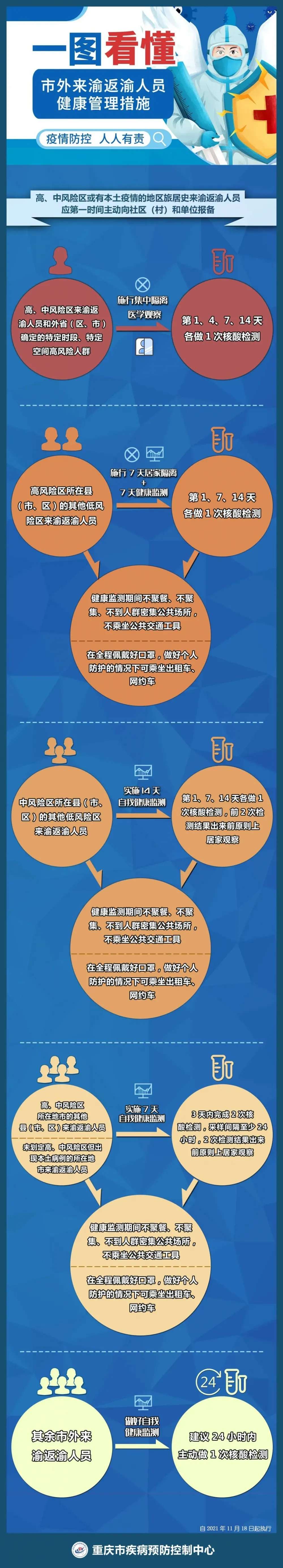8 |6 J% A! U0 z3 t4 @2 j高、中风险区及所在城市和重点地区的来渝返渝人员按《重点地区来渝返渝人员健康管理措施》进行管理。# x: @3 k6 W% H6 i