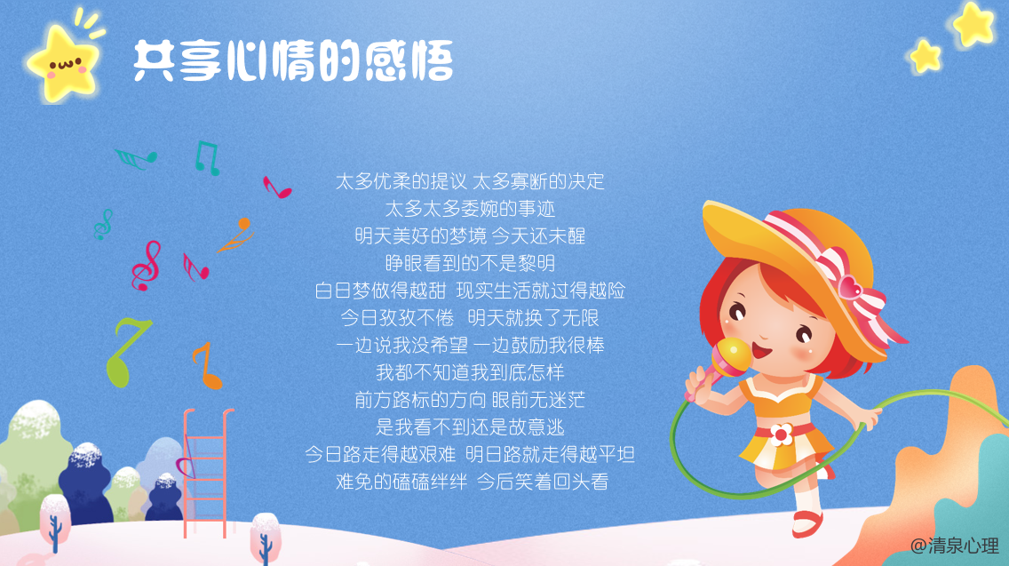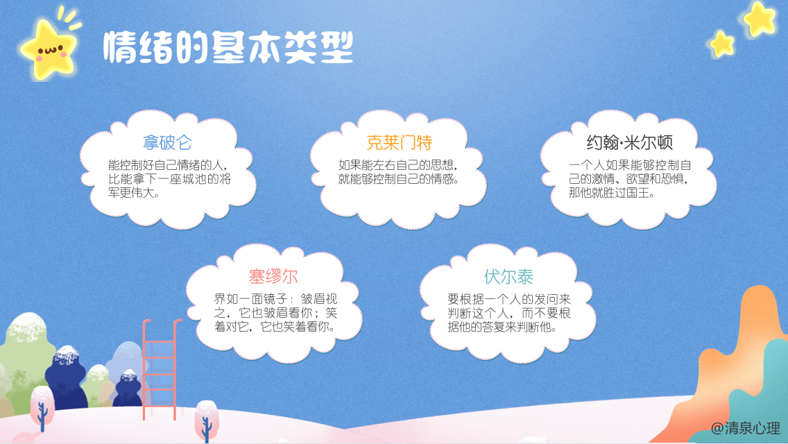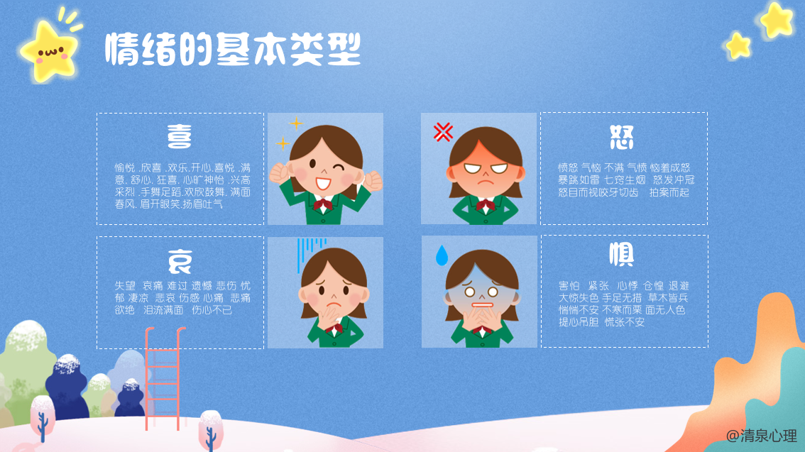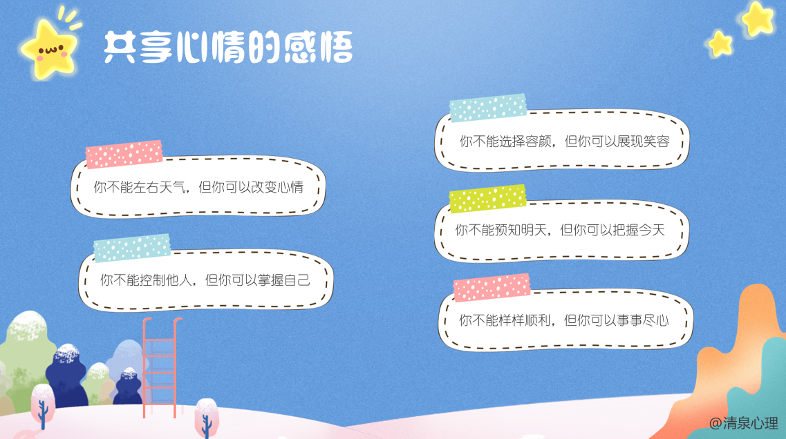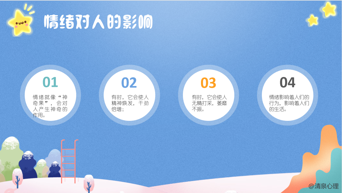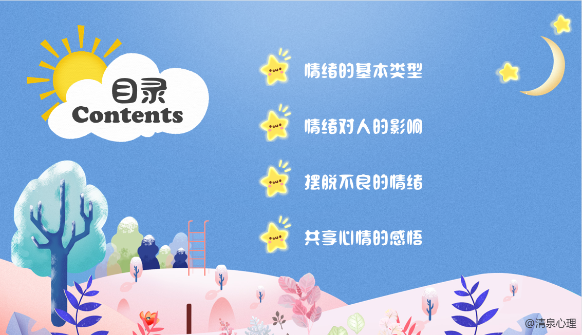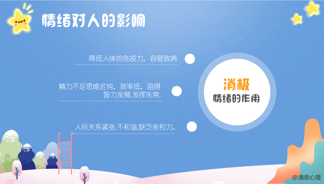自我了解是一个人对自己各个方面的感受和看法。自我肯定则是在了解自己后,能够接纳自己,并且乐于做自己。挖掘自己的优点和长处,提高自我形象,并学习尊重以及欣赏别人。了解情绪中的积极情绪可以帮助学生实现自我肯定、挖掘自身优点、实现自我成长。了解情绪中的消极情绪可以帮助学生体察情绪继而去表达、去宣泄,将情绪问题的不良影响降低。