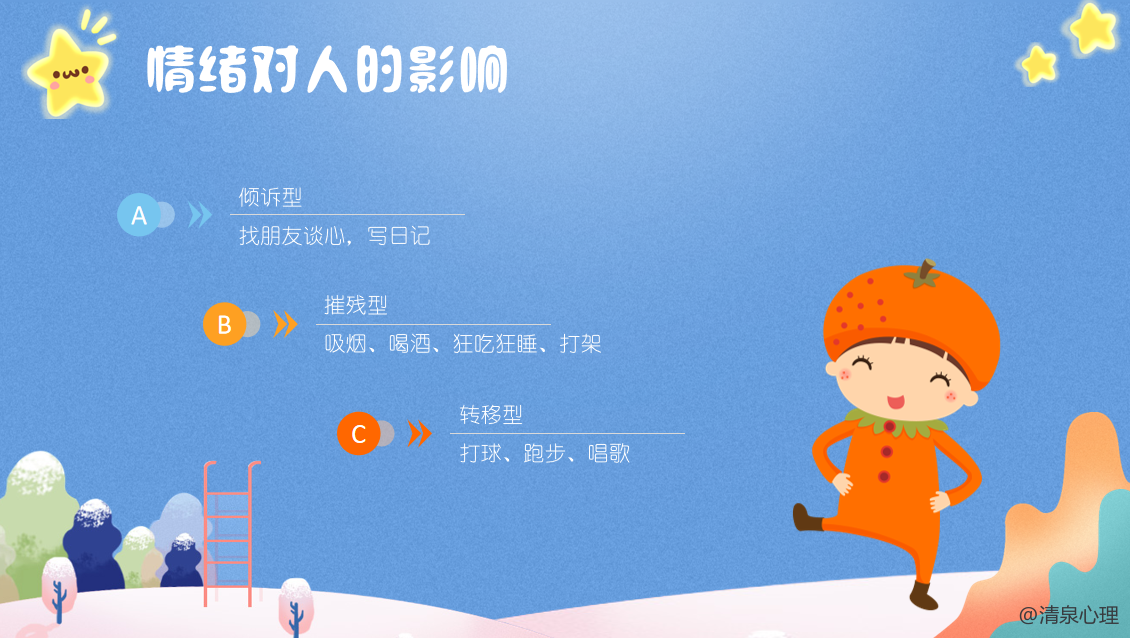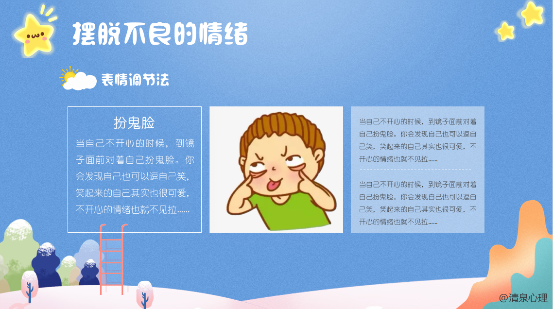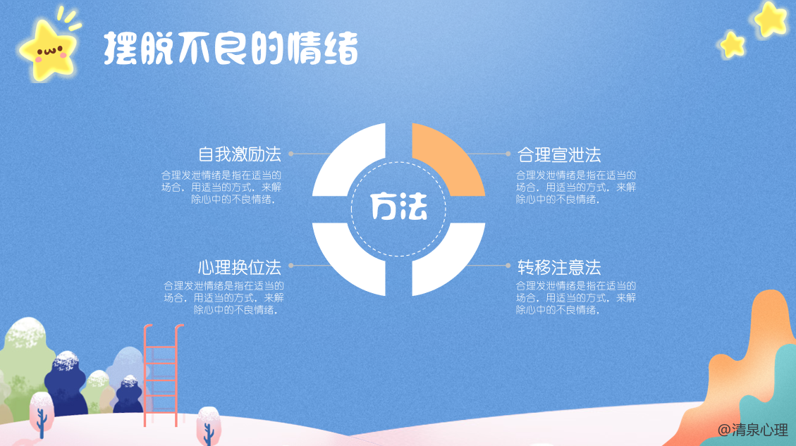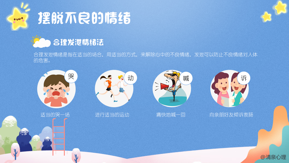 情绪的管理不是要去除或压制情绪,而是在觉察情绪后,调整情绪的表达方式,通过一定的策略和机制,使情绪在生理活动、主观体验、表情行为等方面发生一定的变化,从而使人学会以适当的方式在适当的情境表达适当的情绪。