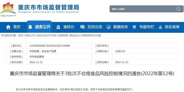 0 Q. t* F- a) x11月21日,重庆市市场监督管理局发布消息,在2022年国家市场监督管理总局本级食品安全监督抽检中,我市有3批次食品不合格。 % ~ _( k$ M9 C7 Q