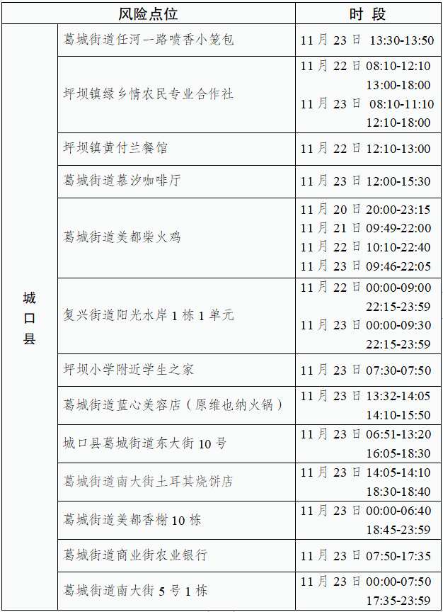 2022年11月26日,城口县新增2例确诊病例和13例无症状感染者,均为隔离管控人员。现将在渝主要活动轨迹的风险点位和时间通告如下:
