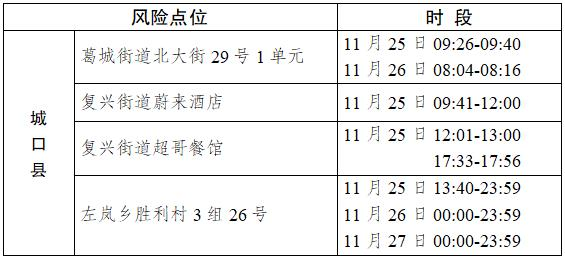 2022年11月28日,城口县新增2例确诊病例(轻型)和3例无症状感染者。现将在渝主要活动轨迹的风险点位和时间通告如下: