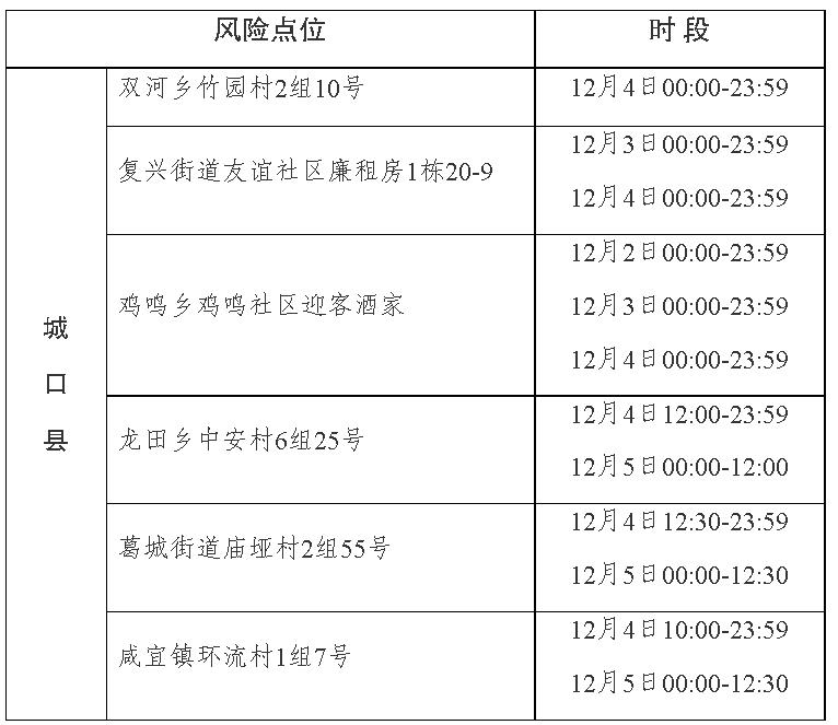 2022年12月5日,城口县新增3例确诊病例(其中1例为此前判定的无症状感染者),新增16例无症状感染者,均为隔离管控中的人员。现将在渝主要活动轨迹的风险点位和时间通告如下: