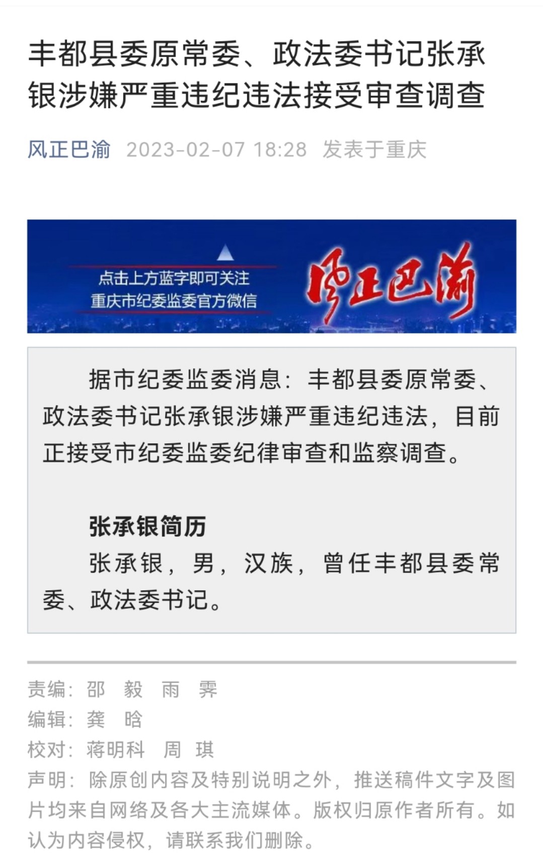 丰都县委原常委、政法委书记张承银涉嫌严重违纪违法接受审查调查