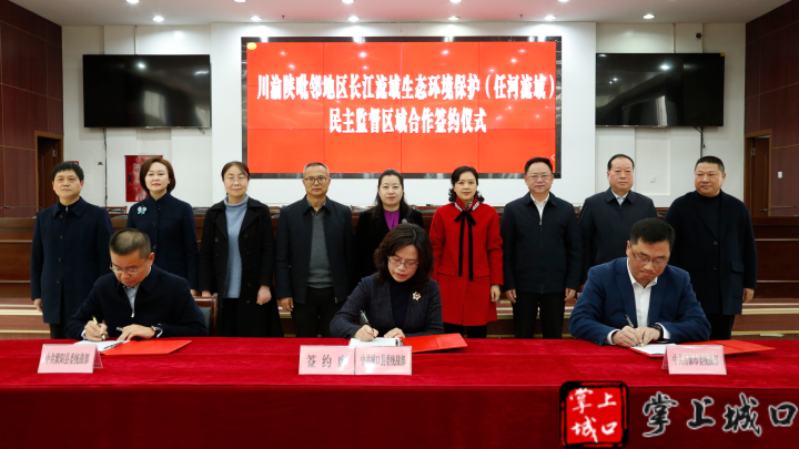 2月28日,渝川陕毗邻地区长江流域生态环境保护(任河流域)民主监督区域合作工作推进会在四川省万源市召开。这是城口县、万源市、紫阳县签订民主监督区域合作签约仪式。县委统战部供图