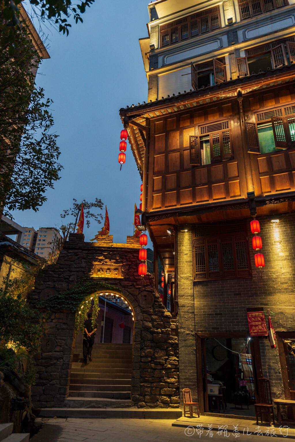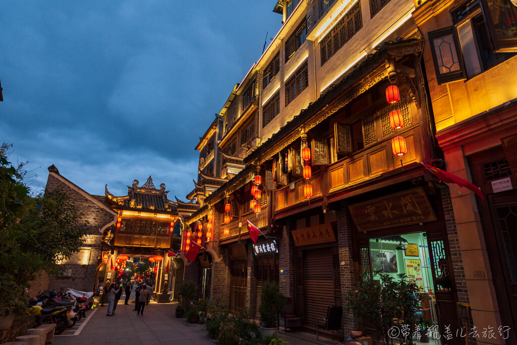从西门原路返回到丁字路口继续前行,则是东门方向,建筑更加多古朴一些,也更热闹一些,此时华灯初上,在灯光的映衬下,土城老街显得更加的漂亮!