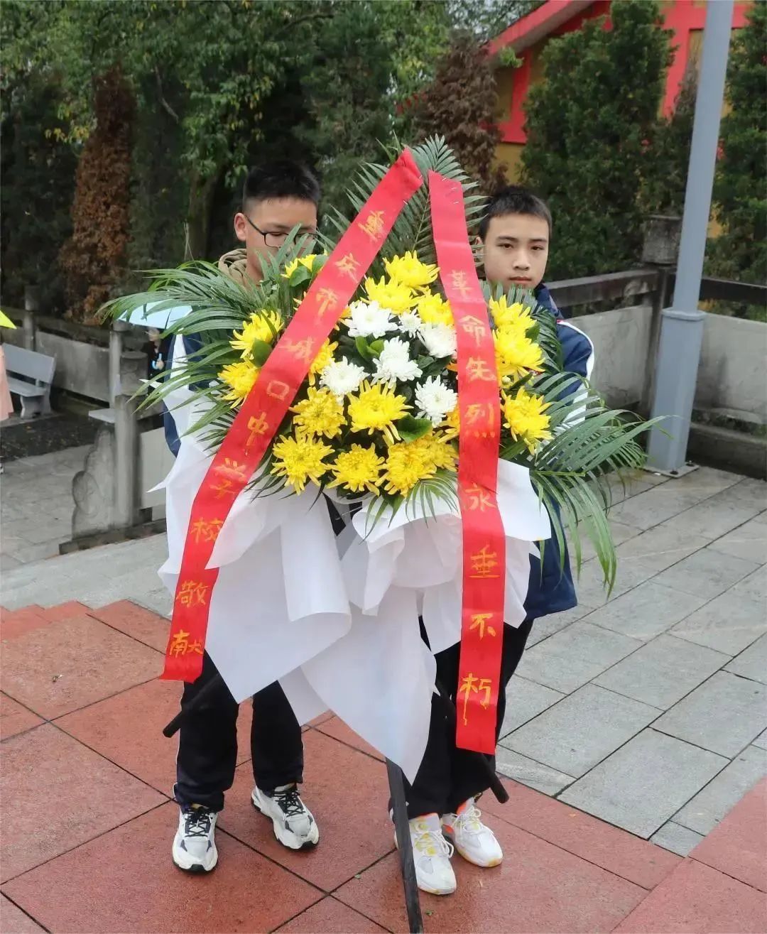 仪式第二项,向革命烈士敬献花篮。伴随着低回的音乐,两位学生代表共同护送花篮,缓步走向纪念碑前。朵朵鲜花寄托着我们深深的哀思,低沉的情绪在此刻转化成坚定的信念,大家深知战争的硝烟早已散去,但是革命先烈的精神却如一颗耀眼的星辰,永远照亮着我们的心灵。也正是因为有了过往无数革命先烈的浴血奋战,不怕牺性,才铸就了我们今天的幸福美好生活。