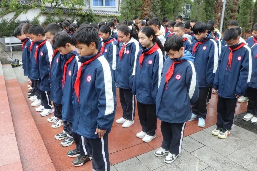 同学们怀着崇敬之情向英勇献身的革命英烈鞠躬并默哀三分钟。