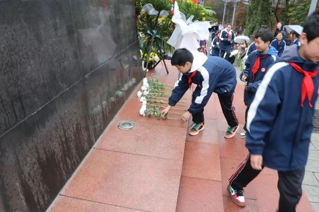 党员教师代表和同学们依次向前,献上鲜花,瞻仰革命先烈纪念碑。同学们小心翼翼地献上小白花,以表达对革命英烈崇高的敬意、深切的缅怀。